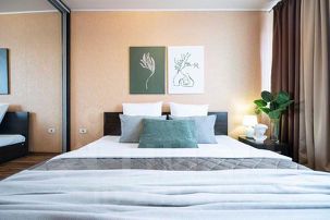 В спальне идеальную для отдыха атмосферу создают кровать нестандартных размеров, с удобным ортопедическим матрасом, лаконичный интерьер в теплых естественных тонах, плотные портьеры, обеспечивающие полную светоизоляцию и качество сна.
