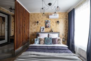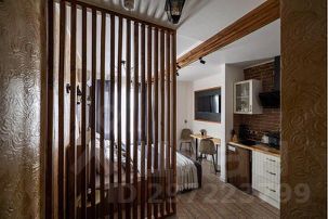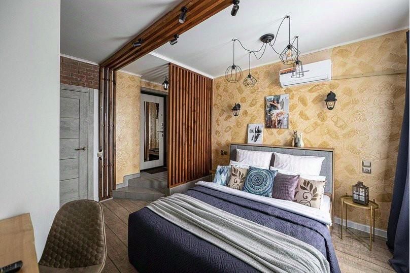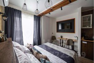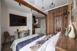 - В интерьере гостиной уютно сочетаются кухонная и обеденная зоны в виде студии. Мебель комнаты удачно гармонирует с дизайнерскими аксессуарами.Эко-перегородка замечательно зонирует пространство гостиной.После насыщенного дня вы сможете отлично отдохнуть на двуспальной кровати с ортопедическим матрасом. Индивидуальный комфортный микроклимат гарантирует наличие кондиционера. Свободному времяпровождению способствуют Wi-Fi и кабельное телевидение со множеством каналов различной тематики. Для плодотворного рабочего процесса, а также для принятия ароматной трапезы, предусмотрен стол со светильником и стулья.