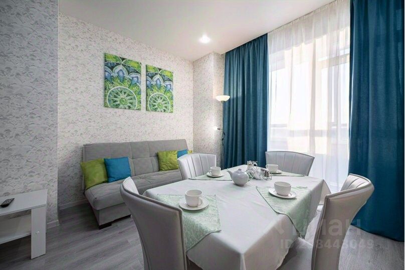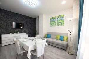 - Каждый гость, переступив порог гостиной, сразу попадает в атмосферу уюта, легкости и свежести. Мягкий раскладной диван отлично послужит для комфортного отдыха и при необходимости, образует полноценное двуспальное место. Для проведения досуга гостям доступны высокоскоростной Wi-Fi и кабельное телевидение с каналами различной тематики. Для размещения вещей послужит журнальный стол и комод. Гостиная прекрасно совмещена с кухонной зоной. Благодаря белоснежному кухонному гарнитуру, наличию всей бытовой техники, светлой обеденной зоне, набору посуды и кухонных принадлежностей, гости могут в полной мере насладиться привычными блюдами на свой вкус.
