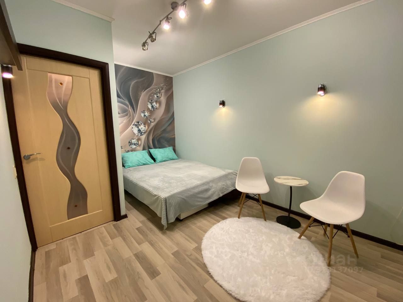 • двуспальное место в комнате, новый матрас, подушки, текстиль, несколько сценариев освещения