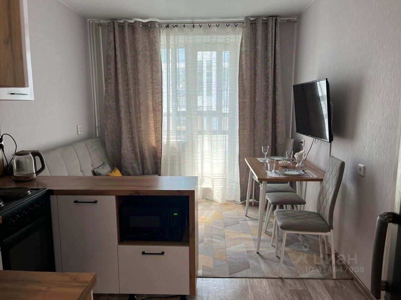 С новой мебелью и техникой (кондиционер, телевизор, холодильник, плита, чайник, микроволновка, стиральная машина, фен, утюг)