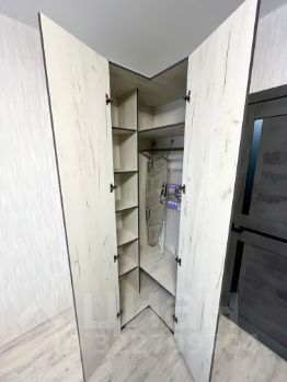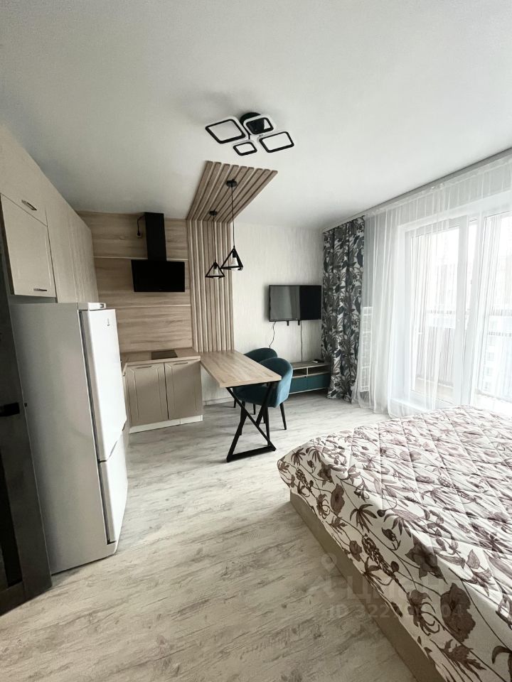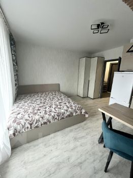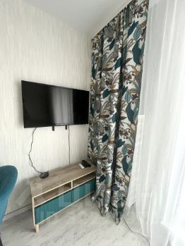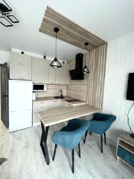 В комнате: Современный кухонный гарнитур, индукционная плита, вытяжка, микроволновая печь, чайник, холодильник, обеденная зона, два кресла/стула, тумбочка, телевизор со smart приставкой(множество бесплатных онлайн кинотеатров), угловой вместительный шкаф, шикарная двухспальная кровать размером 180*200 с уютным покрывалом, люстра с тремя режимами работы и пультом, блекаут шторы и нежная тюль/сетка.