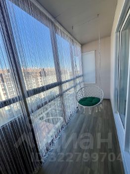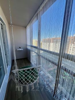 Балкон это отличное место для отдыха с прекрасным панорамным видом во двор. Тут все сделали для вашего уюта: балкон обшит и на полу ламинат, висит качелька с мягкой подушкой, есть мини столик и шторы/нити.