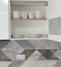варочная панель, духовой шкаф, вытяжка, микроволновая печь, чайник), обеденный стол, посуда.