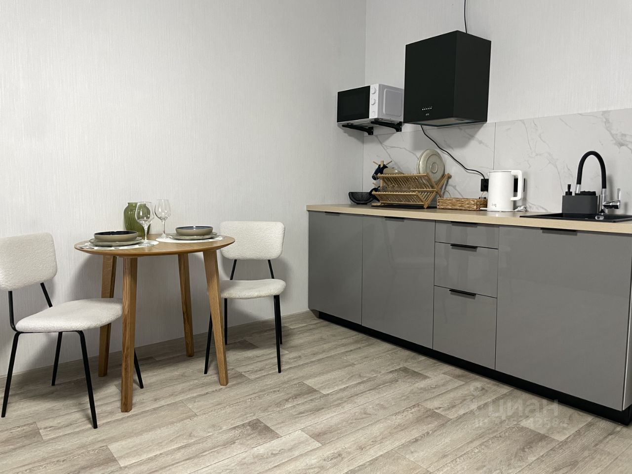 В студии выполнен современный евроремонт, что создаёт уютную атмосферу. Кухня и жилая зона полностью меблированы. Диван раскладывается. В наличии вся необходимая техника: кондиционер, холодильник, микроволновая печь, телевизор и стиральная машина. Санузел совмещённый, оборудован душевой кабиной, что добавляет удобства. Посуда.