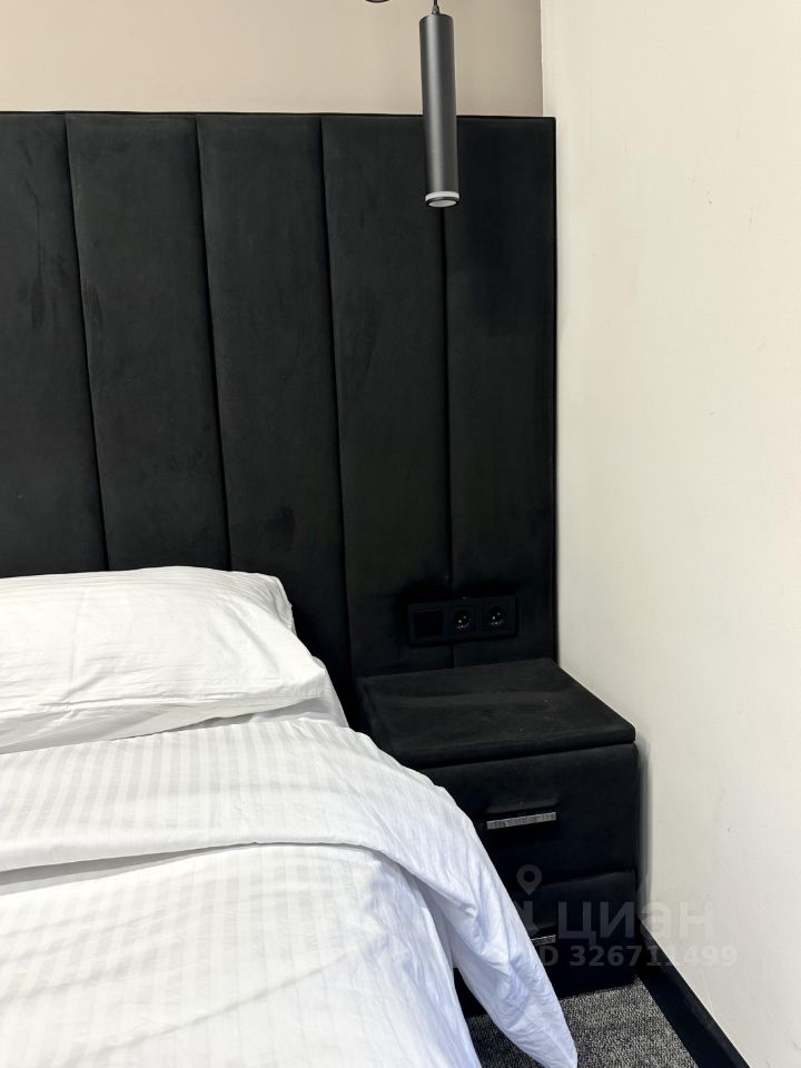 • Большая двуспальная кровать с мягким изголовьем и белоснежным постельным бельем.