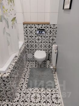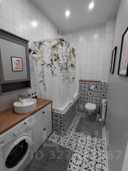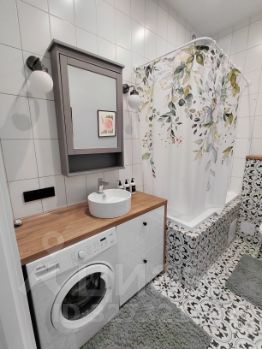 Cанузeл совмещенный, оформлен стильной плиткой, оснащён ванной и стиральной машиной.