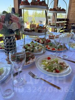 Кухоная зона (большой стол, стулья 6 шт, холодильник, микроволновая печь, посудомойная машина, индукционная варочная панель , духовой шкаф, чайник и очень много посуды)