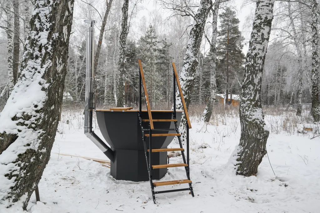 На территории находится чан, с видом на сосновый лес