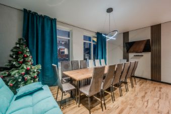 -Кухня-гостиная (в гостиной есть двуспальный диван) два обеденных стола, соединены вместе их можно разъединить и вынести на террасу. Вай фай, телевизор, кухонная зона с духовым шкафом и микроволновкой