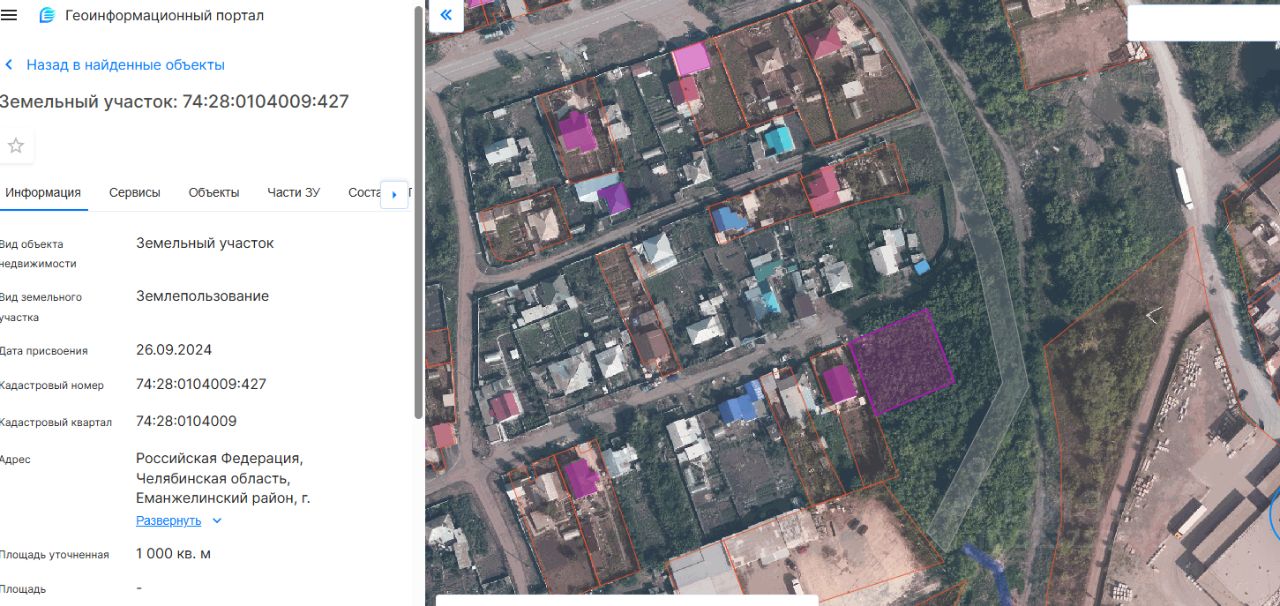 Земельный участок, площадью 1000 кв.м., кадастровый номер 74:28:0104009:427, расположенный по адресу: г. Еманжелинск, ул. Калинина, земельный участок 1, вид разрешенного использования "Для индивидуального жилищного строительства"