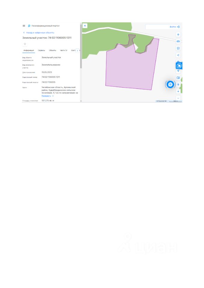 Земельный участок, государственная собственность на который не разграничена, площадью 151 275 кв. м. с кадастровым номером 74:02:1106005:1311, расположенный по адресу: Челябинская область, Аргаяшский район, Худайбердинское сельское поселение, 1,7 км. по направлению на восток от п. Башакуль.