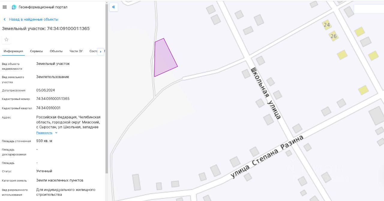 Земельный участок, общей площадью 939 кв.м., с кадастровым номером: 74:34:0910001:1365, расположенный по адресу: Челябинская обл., Миасский городской округ, с. Сыростан, ул. Школьная, западнее участка 12, разрешенное использование для индивидуального жилищного строительства, категория земель: земли населенных пунктов.