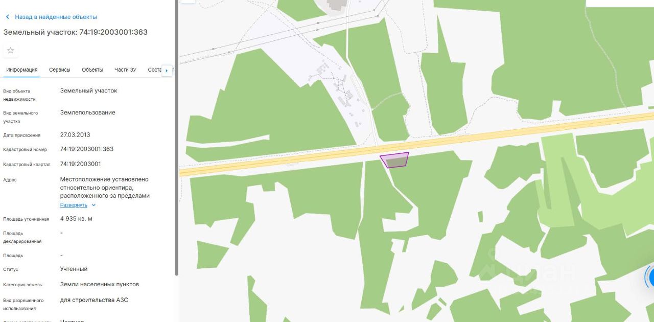 Земельный участок площадью 4935 кв.м., кадастровый номер 74:19:2003001:363, категория земель: земли населенных пунктов, вид разрешенного использования: для строительства АЗС, местоположение установлено относительно ориентира, расположенного за пределами участка. Ориентир п. Смолино. Почтовый адрес ориентира: Челябинская обл, р-н Сосновский