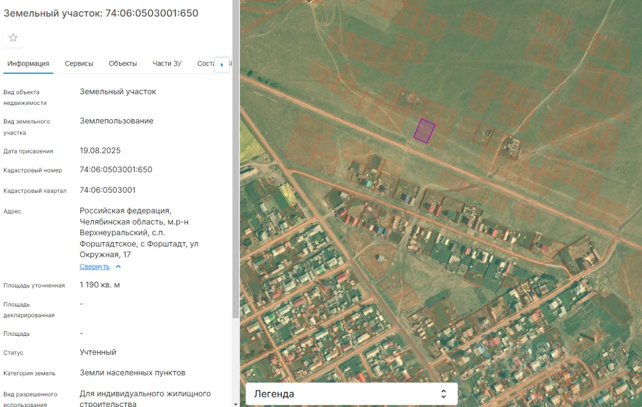 Земельный участок из земель населённых пунктов, с видом разрешенного использования "для индивидуального жилищного строительства", с кадастровым номером 74:06:0503001:650, расположенный по адресу: Челябинская область, Верхнеуральский м.р-н, сп Форштадтское, с.Форштадт, ул.Окружная, 17, общей площадью 1190 кв.м.