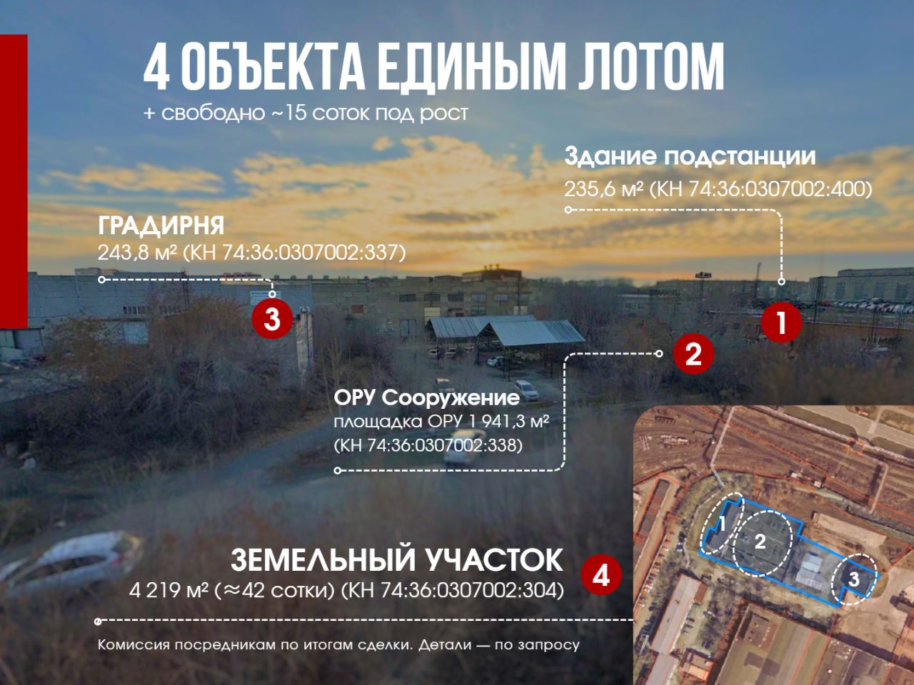 площадь 235,6 кв. м, кадастровый номер 74:36:0307002:400 — трансформаторная подстанция 35/6 кВ, часть мощностей и помещений арендует сетевая компания (арендный доход + профессиональное обслуживание).
