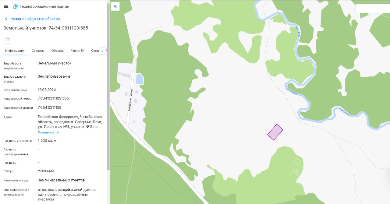 Земельный участок, общей площадью 1500 кв.м., с кадастровым номером: 74:34:0311109:385, расположенный по адресу: Челябинская обл., западнее п. Северные Печи, ул. Проектная 4, участок 11 по проекту планировки, разрешенное использование отдельно стоящий жилой дом на одну семью с приусадебным участком, категория земель: земли населенных пунктов.