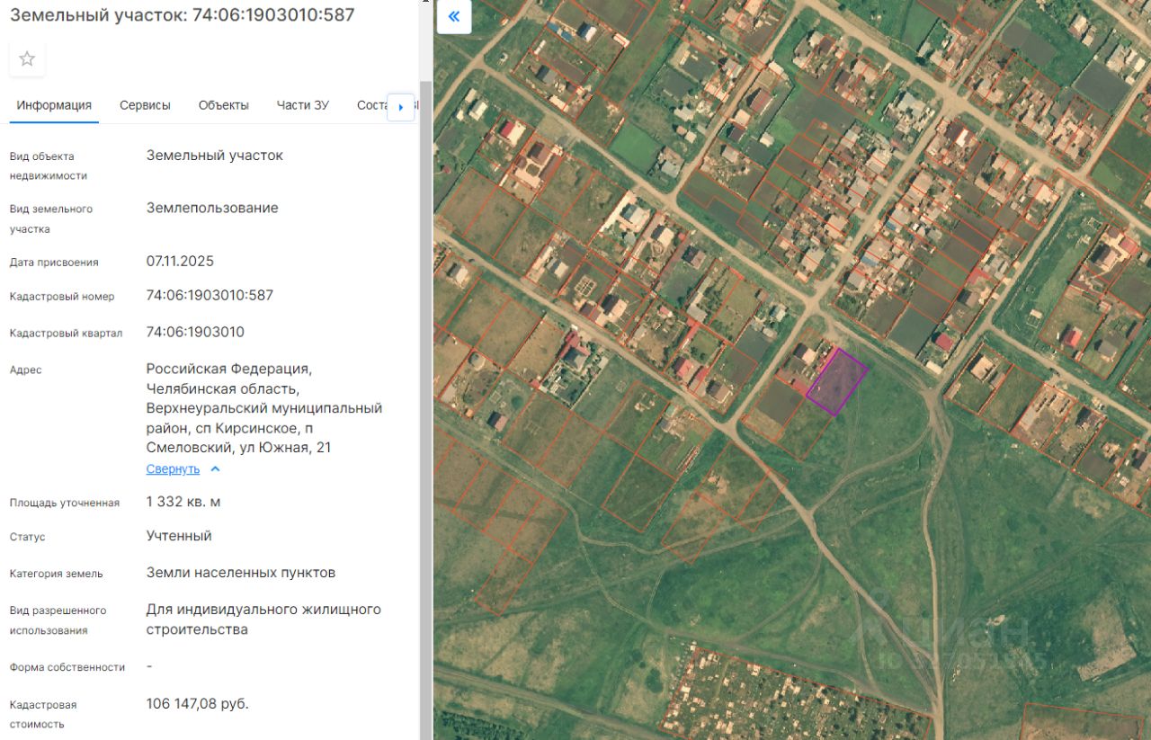 Земельный участок из земель населённых пунктов, с видом разрешенного использования "для индивидуального жилищного строительства", с кадастровым номером 74:06:1903010:587, расположенный по адресу: Российская Федерация, Челябинская область, Верхнеуральский м.р-н, п. Смеловский, ул.Южная, 21, общей площадью 1332 кв.м.