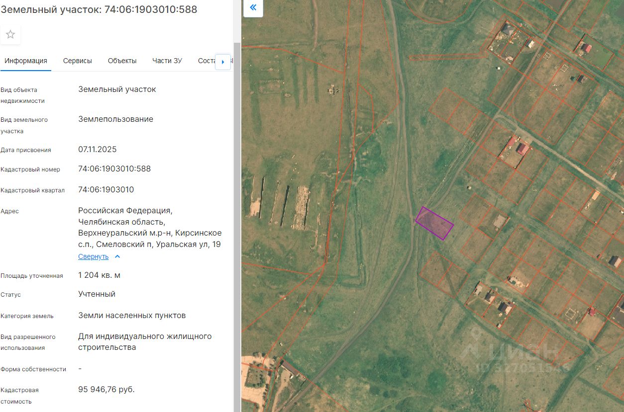 Земельный участок из земель населённых пунктов, с видом разрешенного использования "для индивидуального жилищного строительства", с кадастровым номером 74:06:1903010:588, расположенный по адресу: Российская Федерация, Челябинская область, Верхнеуральский м.р-н, п. Смеловский, ул.Уральская, 19, общей площадью 1204 кв.м.