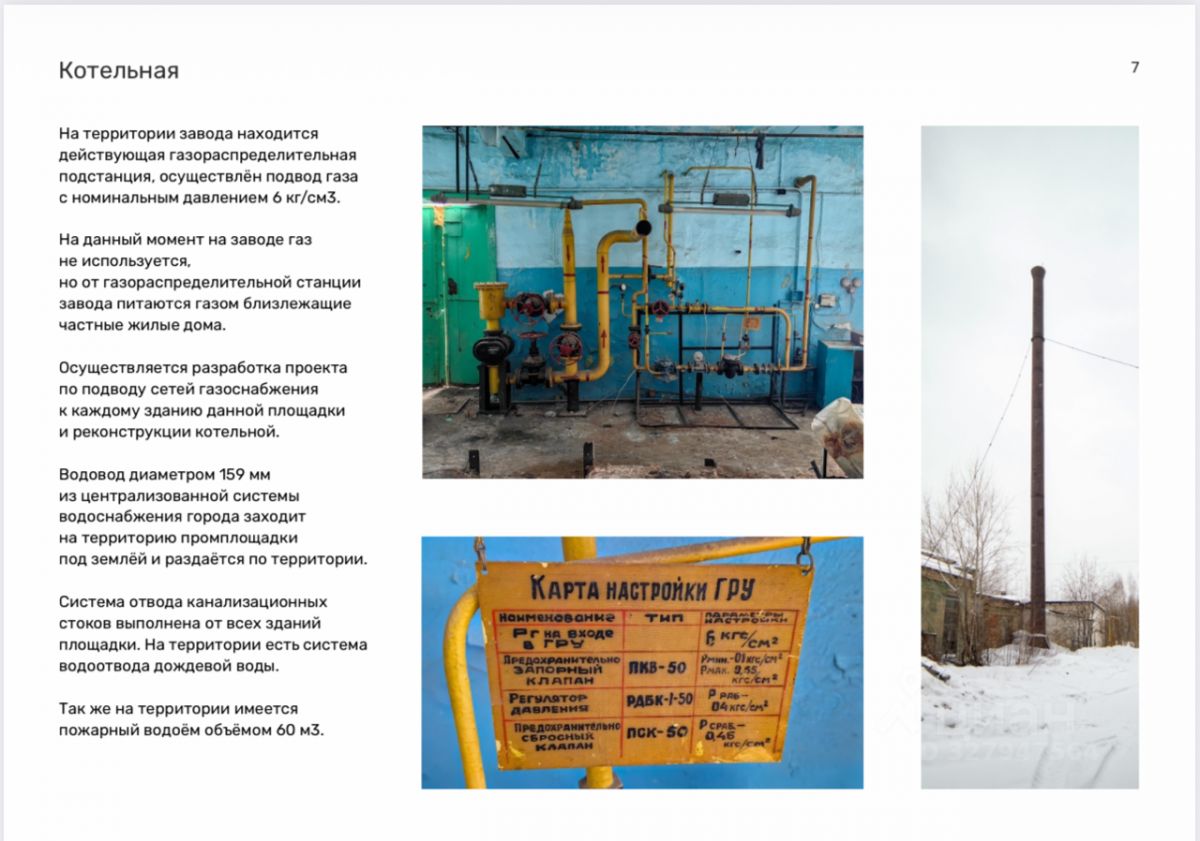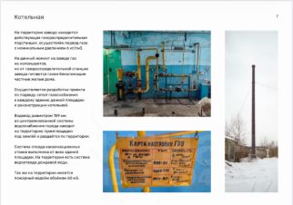 На территории завода есть видеонаблюдение, свет, газ, вода, отопление, 2а крана балки, 3и вышки сотовой связи: МТС, Билайн, Теле2; пожарный водоем, 2а трансформатора 500кВт.