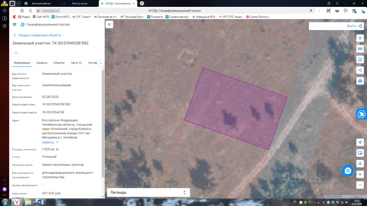 Земельный участок с кадастровым номером 74:30:0104039:592 площадь 1000 по адресу Российская Федерация, Челябинская область, городской округ Копейский, город Копейск, расположенной южнее СНТ им. Мичурина в г. Копейске