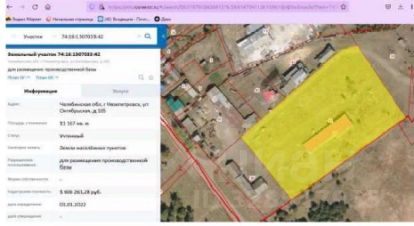 Нежилое здание тарный цех общей площадью 475,7 кв. метров (кадастровый номер 74:16:1307033:25), количество этажей, в том числе подземных этажей: 1, в том числе подземных 0.Земельный участок общей площадью 11 167 кв. метров, кадастровый номер 74:16:1307033:42. Категория земель: земли населенных пунктов.Разрешенное использование: для размещения производственной базы.Местонахождение Имущества: Челябинская область, Нязепетровский район, город Нязепетровск, улица Октябрьская, дом 105, строение 1