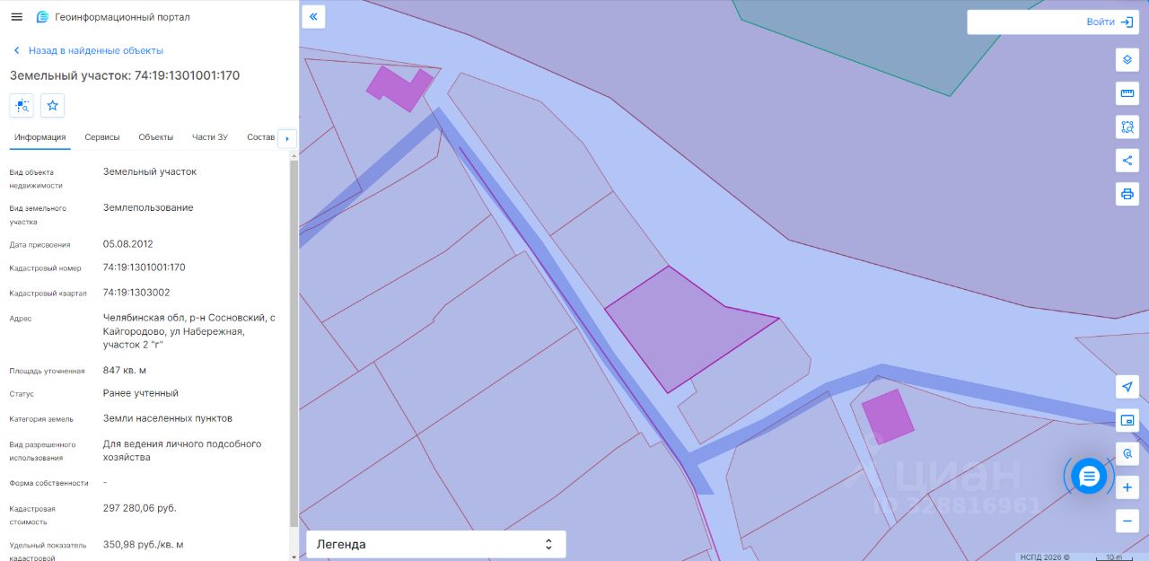 земельный участок площадью 847 кв.м., с кадастровым номером: 74:19:1301001:170, расположенный по адресу:Челябинская обл, р-н Сосновский, с Кайгородово, ул Набережная, участок 2 "г"