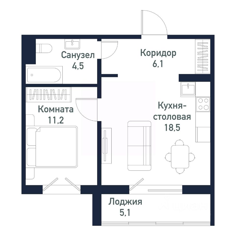Квартира от застройщика - студия + 1 спальня, площадью 40,30 кв.м.