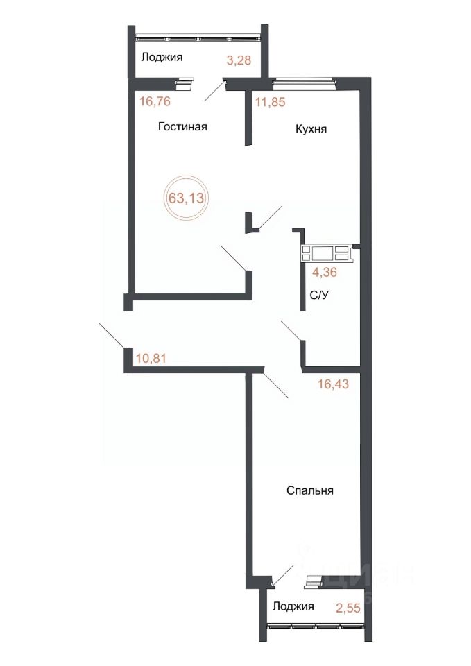 Общая площадь63,13 м²
