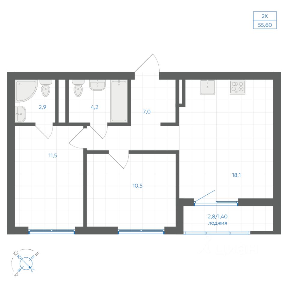 Общая площадь55,6 м²