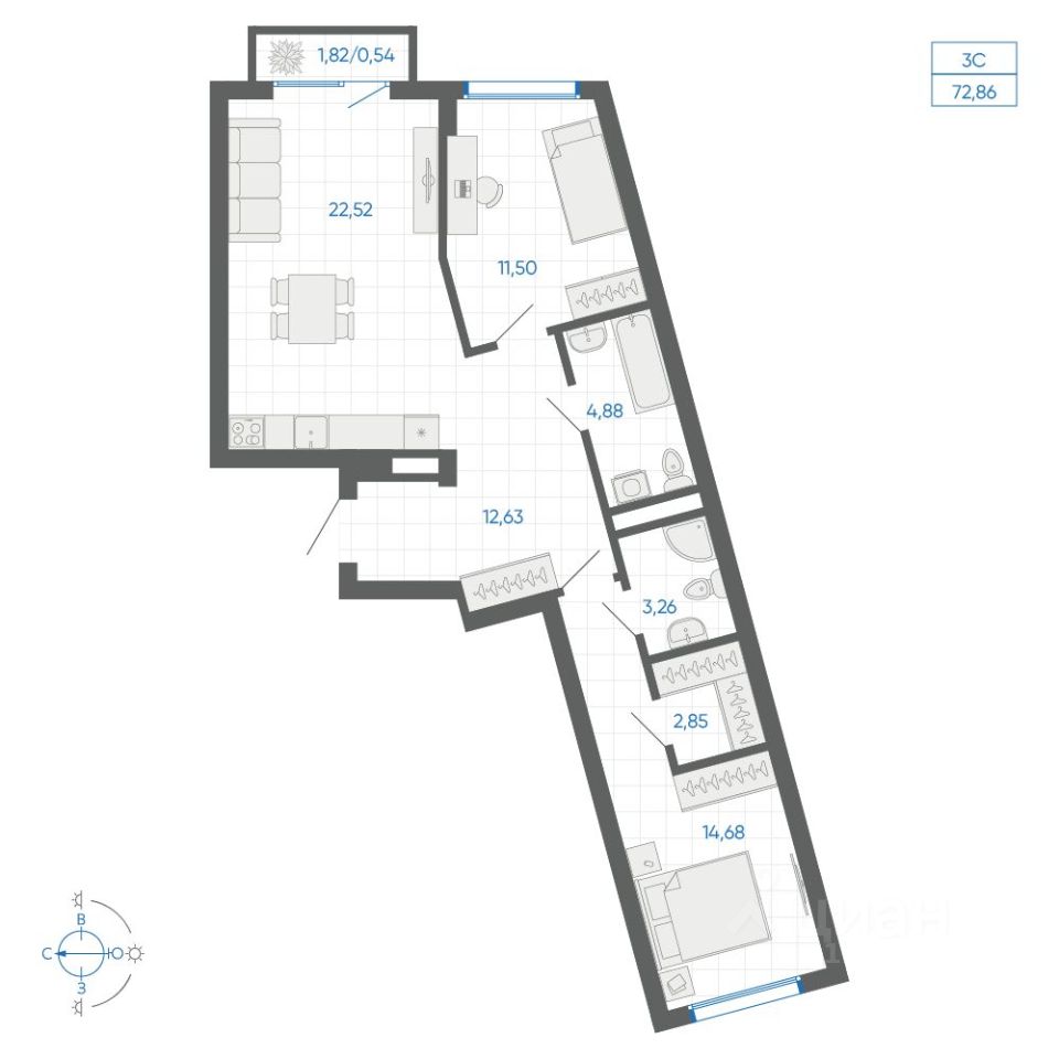 Общая площадь72,86 м²