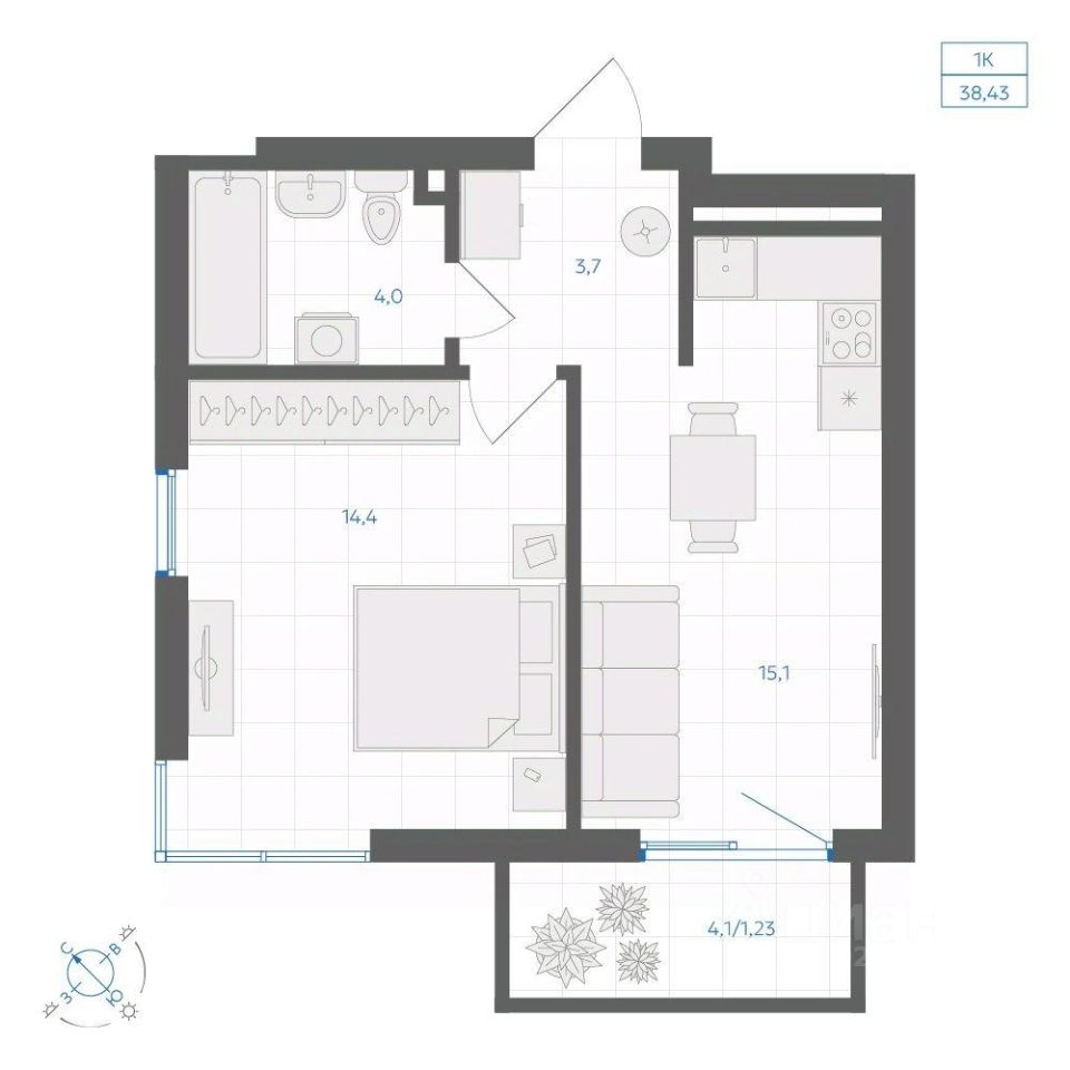 Общая площадь38,43 м²