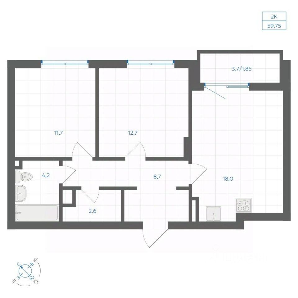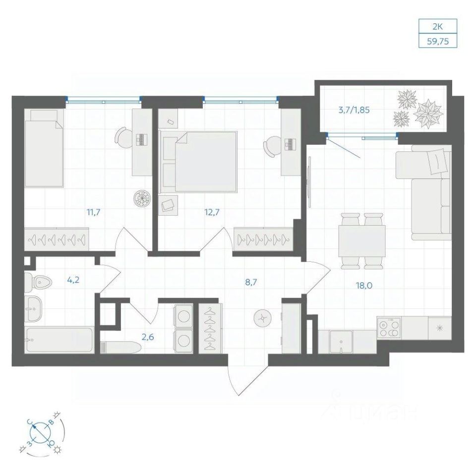 Общая площадь59,75 м²