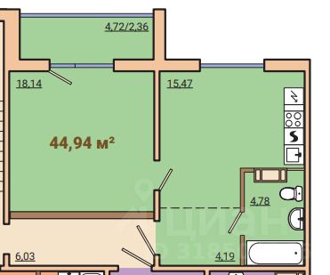 Площадь квартиры 42,58 кв.м
