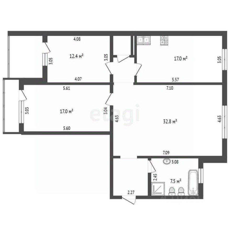 Удобная планировка, три раздельные большие комнаты, что обеспечивает комфортное проживание для семьи. Просторная кухня площадью 17 м2 позволяет удобно разместить обеденную зону и современную технику. Просторный совмещенный санузел 8 м² с окном отличается практичностью и хорошим естественным освещением.