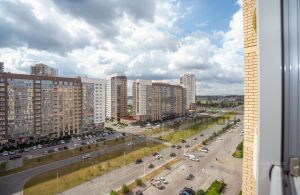 Окна: На две стороны (Восток/Запад). Виды: дворовая территория и проспект Родионова.