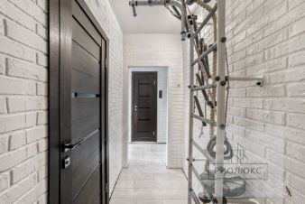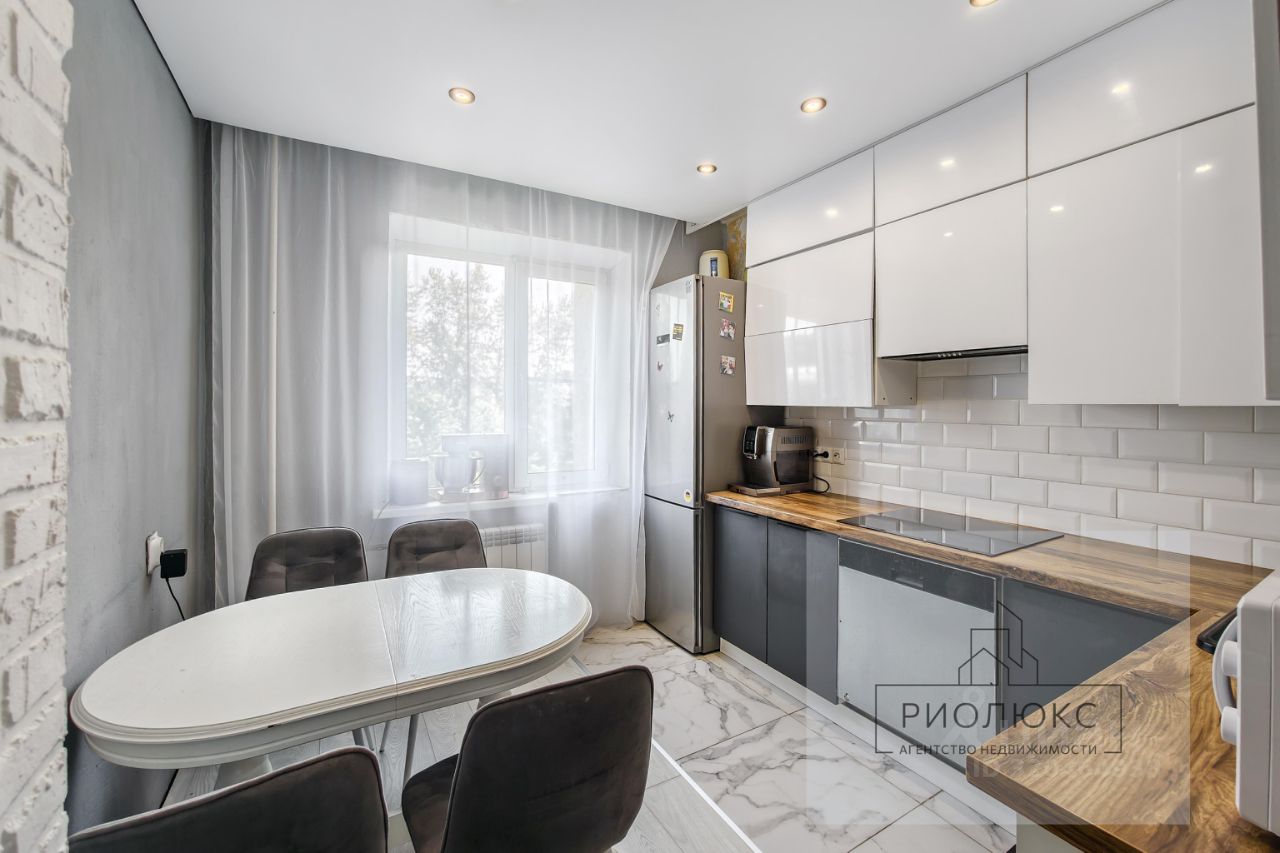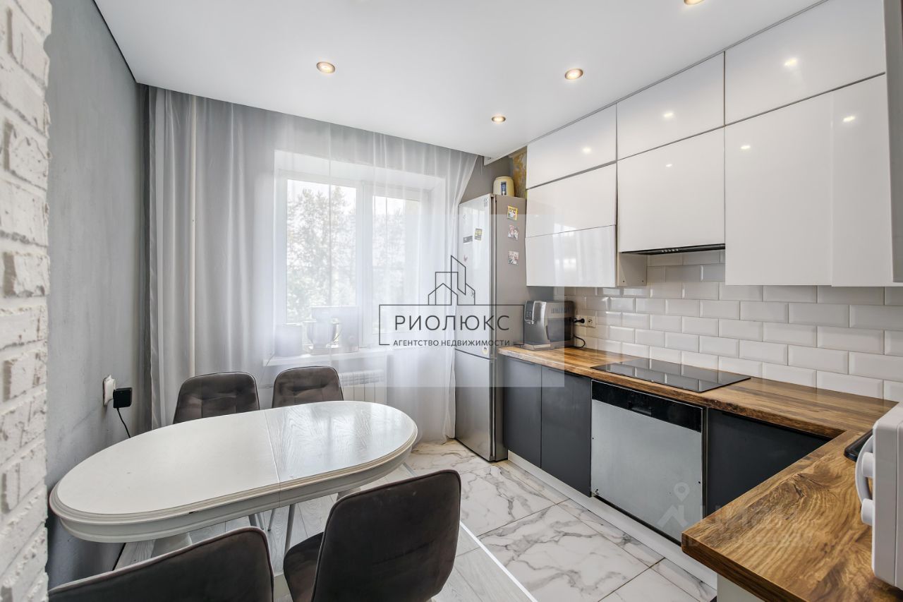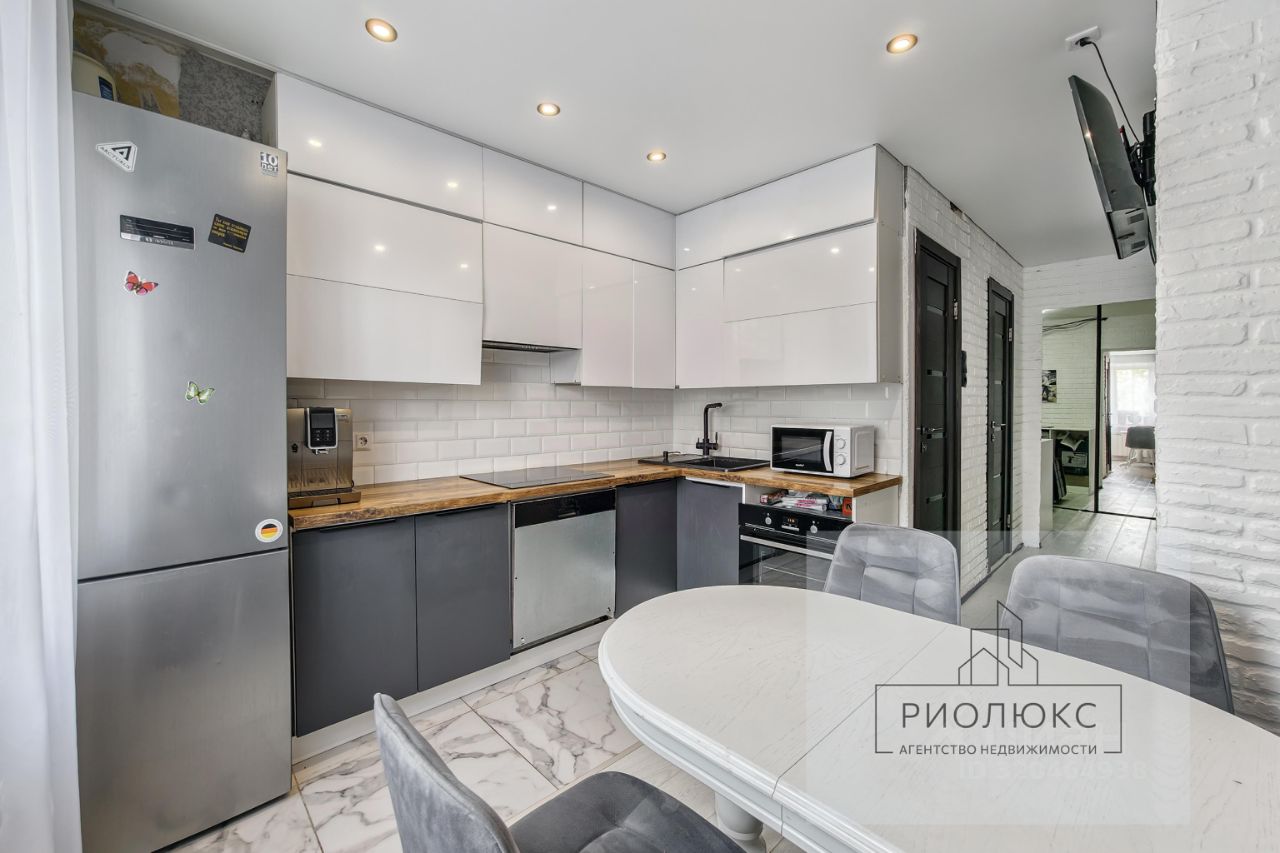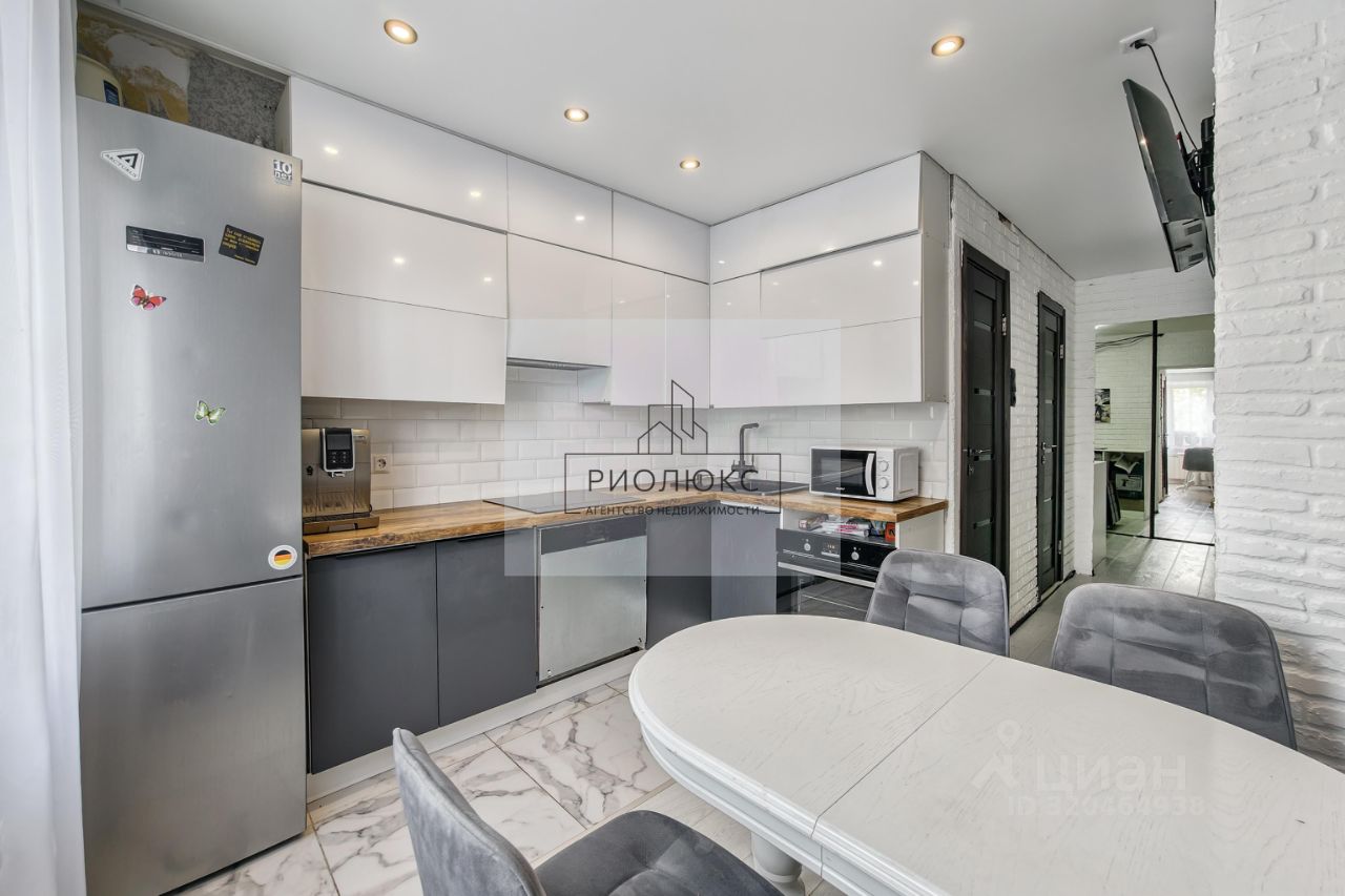 ветлый интерьер в белом и темно-коричневом цветах создает ощущение стиля и уюта. Кухонный гарнитур в отличном состоянии, плитка керамогранит и натяжные потолки добавляют квартире современный вид. В прихожей расположен закрытый зеркальный шкаф от пола и до потолка, что делает пространство визуально больше и удобнее.