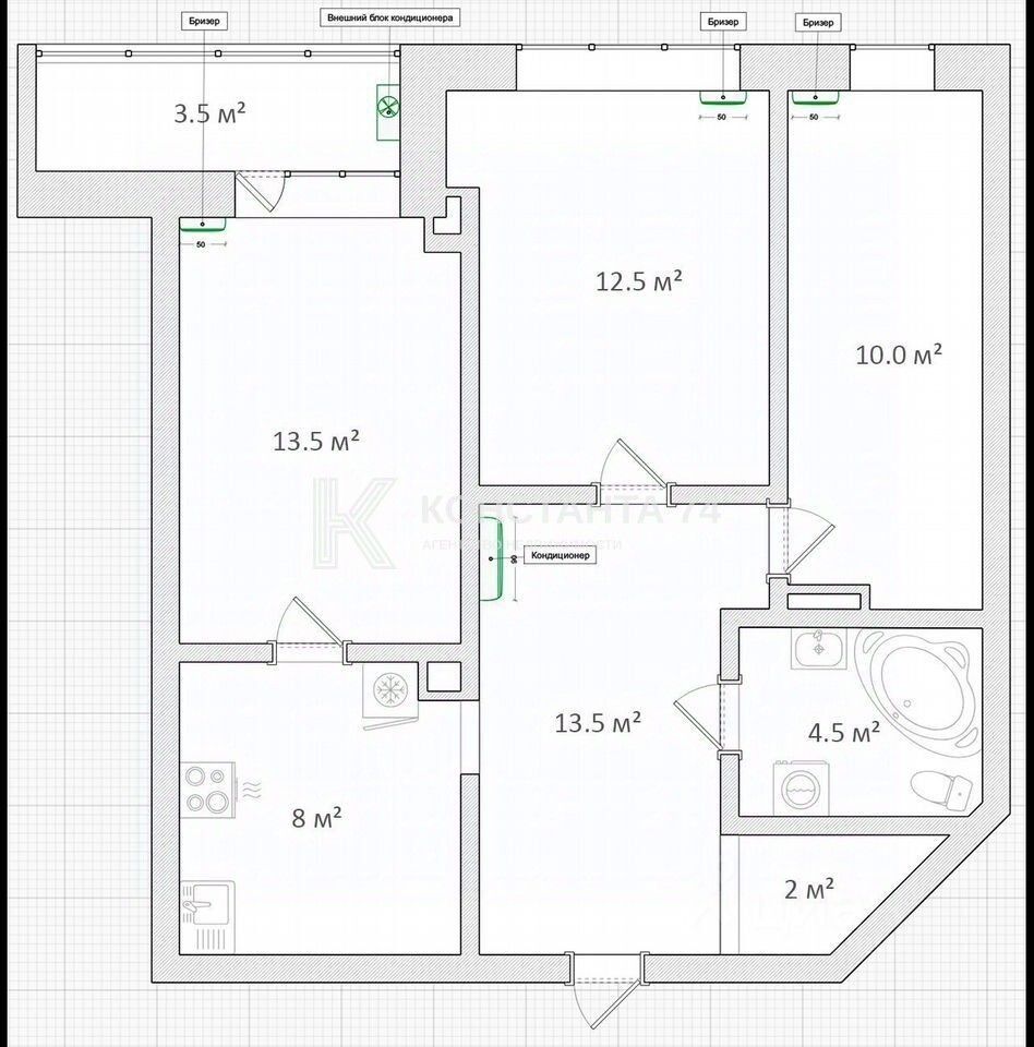 • Современные технологии: в каждой комнате установлена приточная вентиляция с подогревом и фильтрацией (бризер ТИОН), а также кондиционер для комфортного микроклимата.