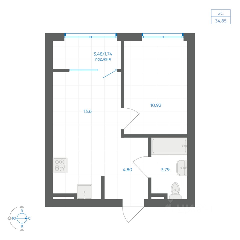 Общая площадь34,85 м²