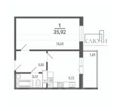 Однокомнатная квартира в черновой отделке общей площадью 35.92 м²