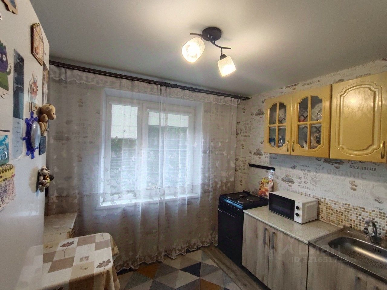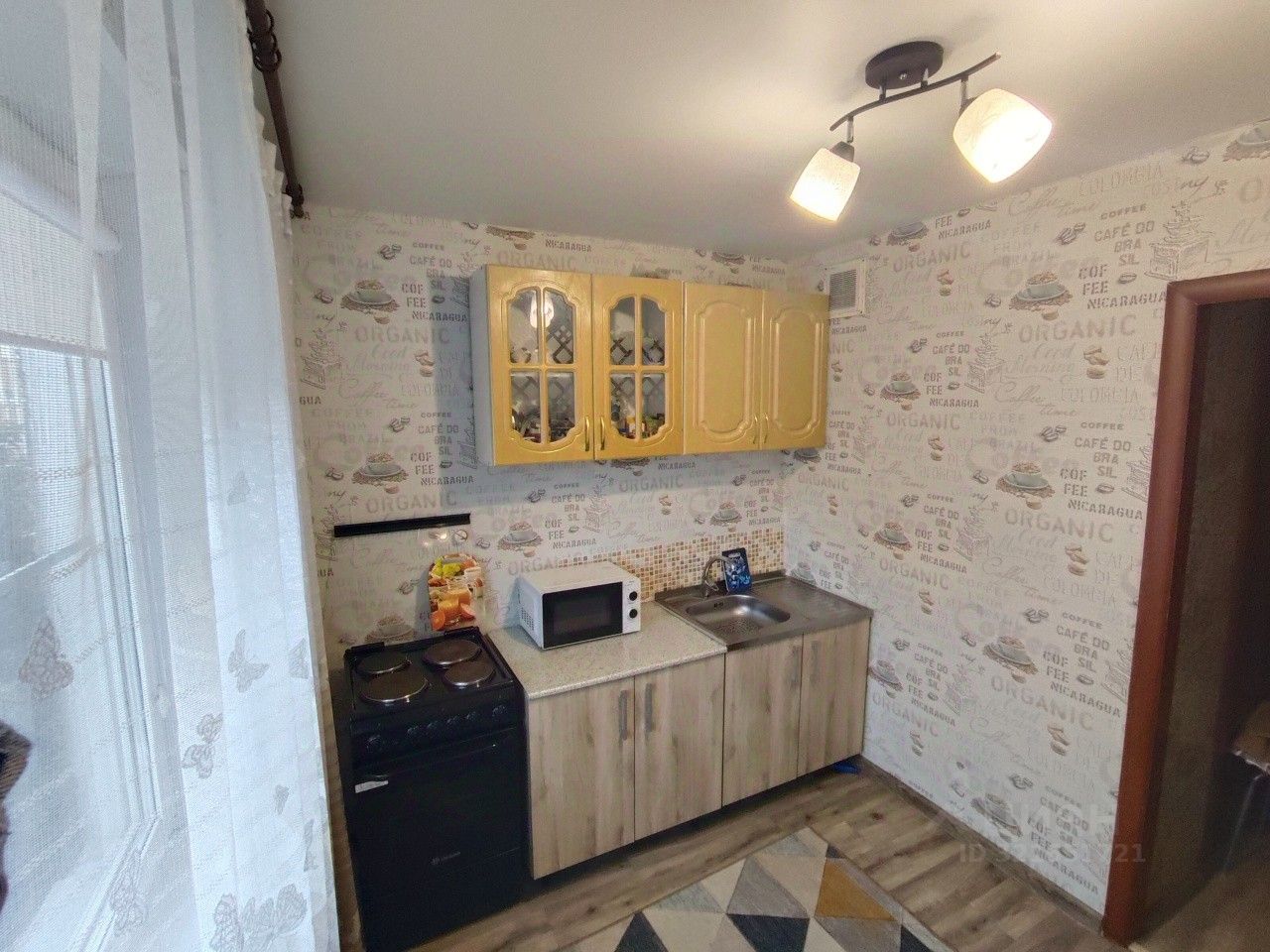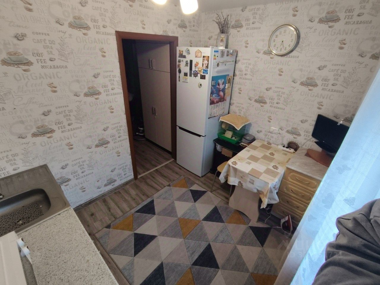 На стенах обои ,на полу линолеум, потолок натяжной.