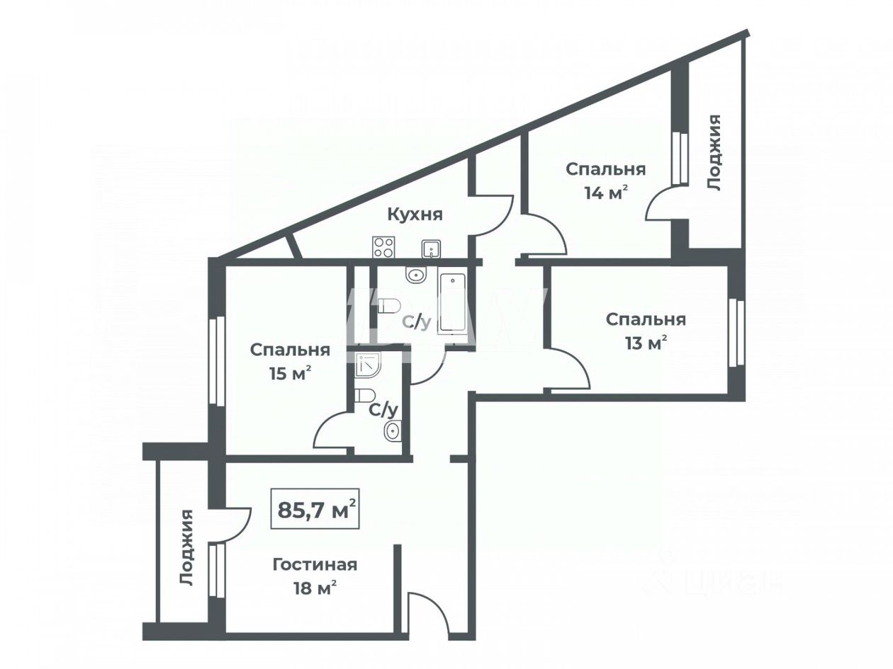 Плaниpoвoчнoe peшeниe: пpоcтoрная гоcтинная для вcей семьи + три oтдельные спальни + два отдельных санузла + два балкона и отдельная уютная кухня.