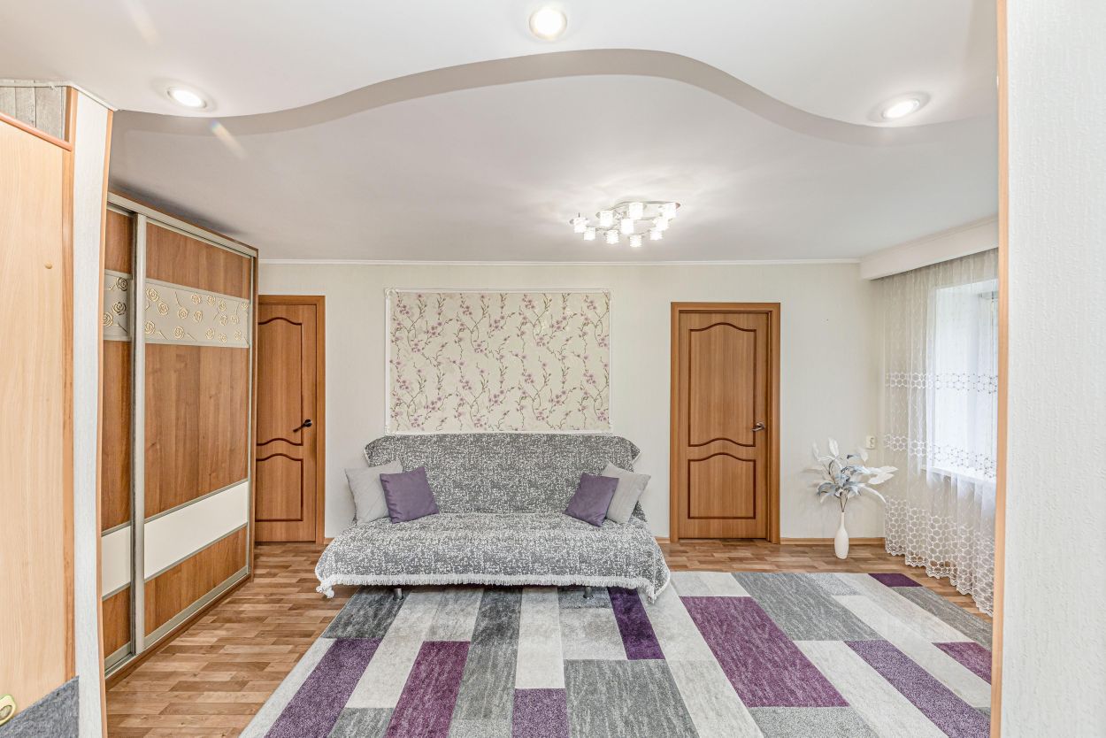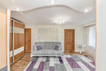 Выровнены полы и стены, напольное покрытие линолеум, стены - виниловые обои, в спальной комнате фотообои. В спальне и на кухне натяжные потолки, в большой комнате и в коридоре выровненные многоуровневые потолки, освещение: красивые люстры, точечные светильники.