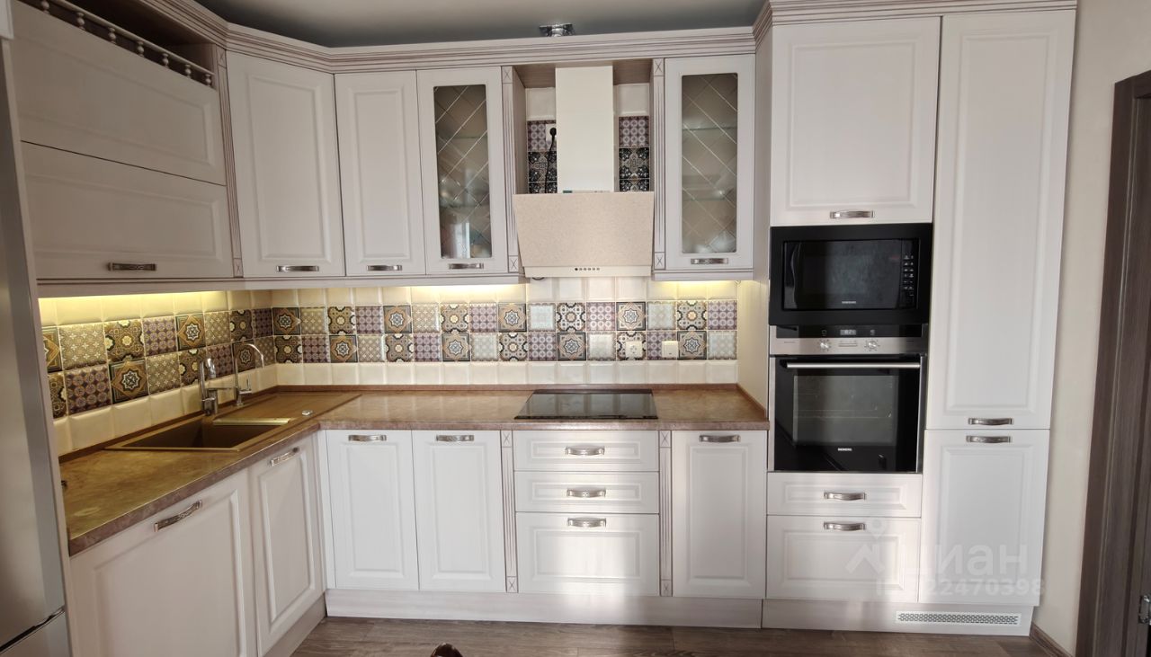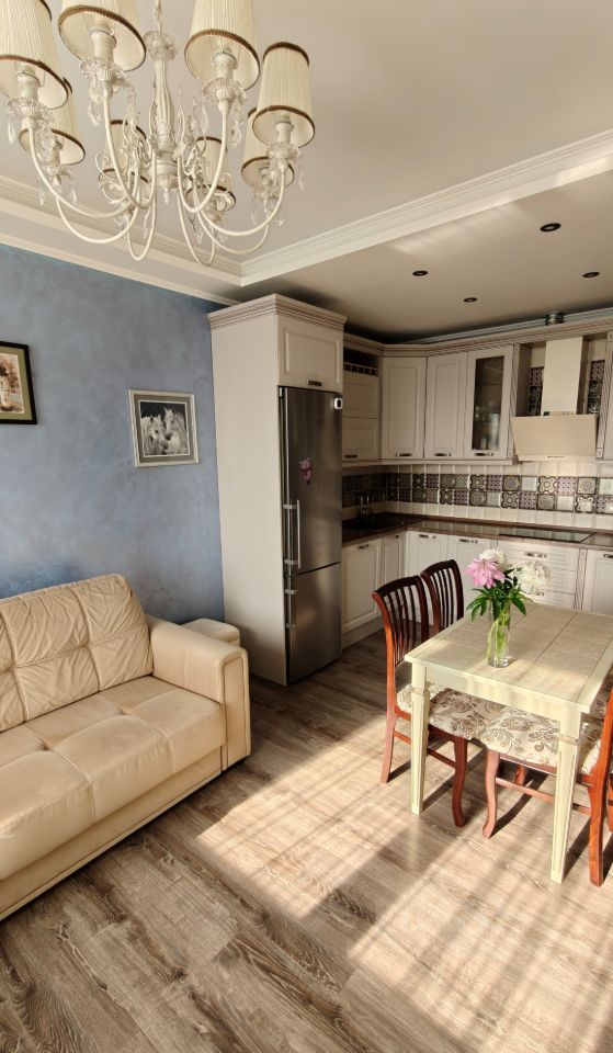* Кухня-гостиная: на стенах декоративная штукатурка. Встроенная техника: посудомоечная машина Воsh, микроволновая печь Sаmsung, варочная поверхность Siеmеns. Фильтр для питьевой воды - обратный осмос. Подсветка по периметру потолка.