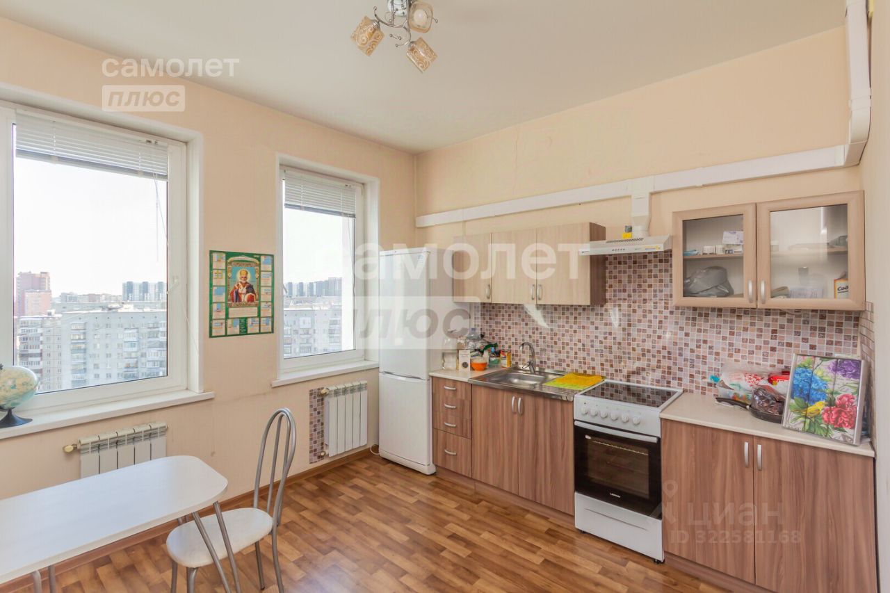 Кухня очень просторная, на полу постелен линолеум. Кухонный гарнитур остаётся новым жильцам. Комнаты раздельные. По всей квартире натяжные потолки, установлены новые межкомнатные двери. Санузел раздельный, с кафельной плиткой на полу.