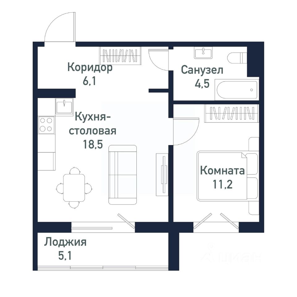 Квартира от застройщика - студия + 1 спальня, площадью 40,60 кв.м.