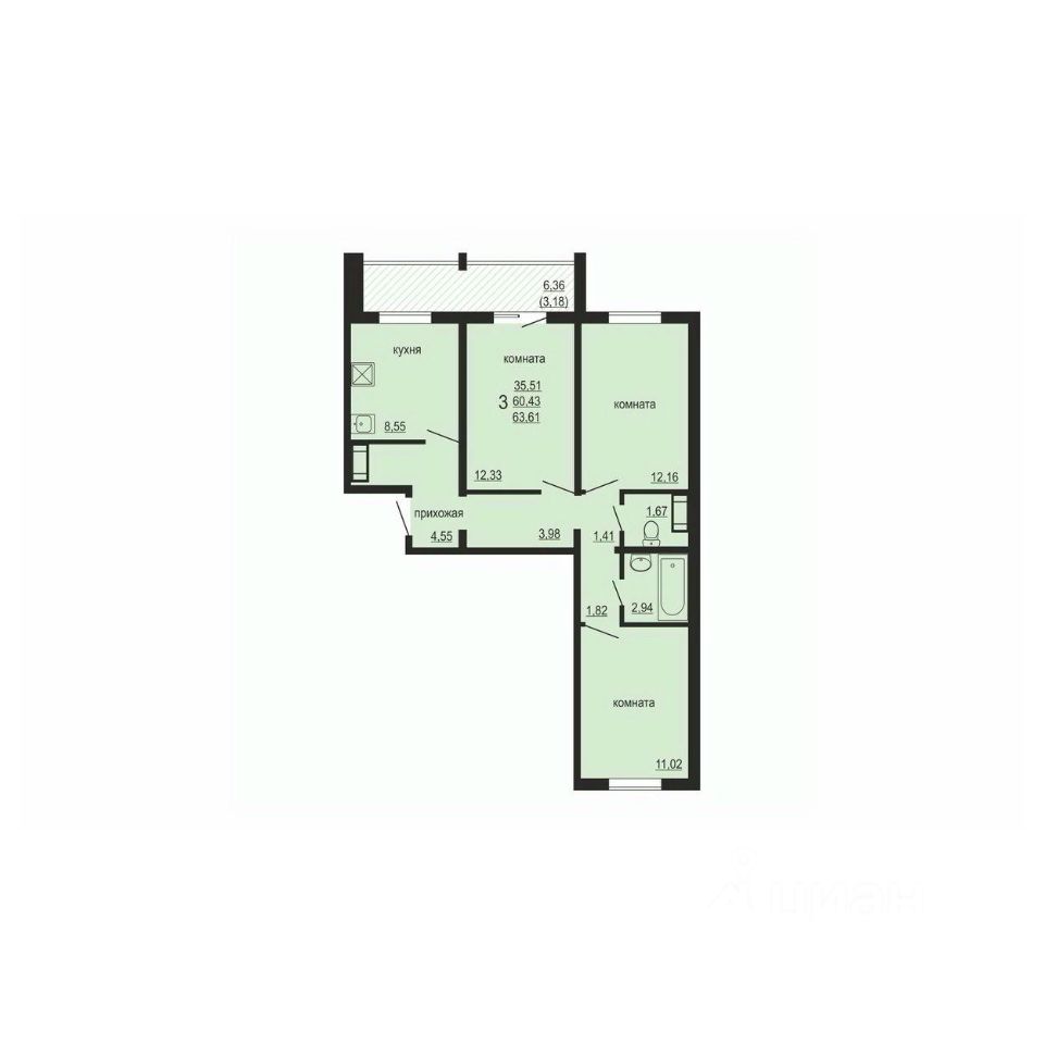 Общая площадь63,61 м²