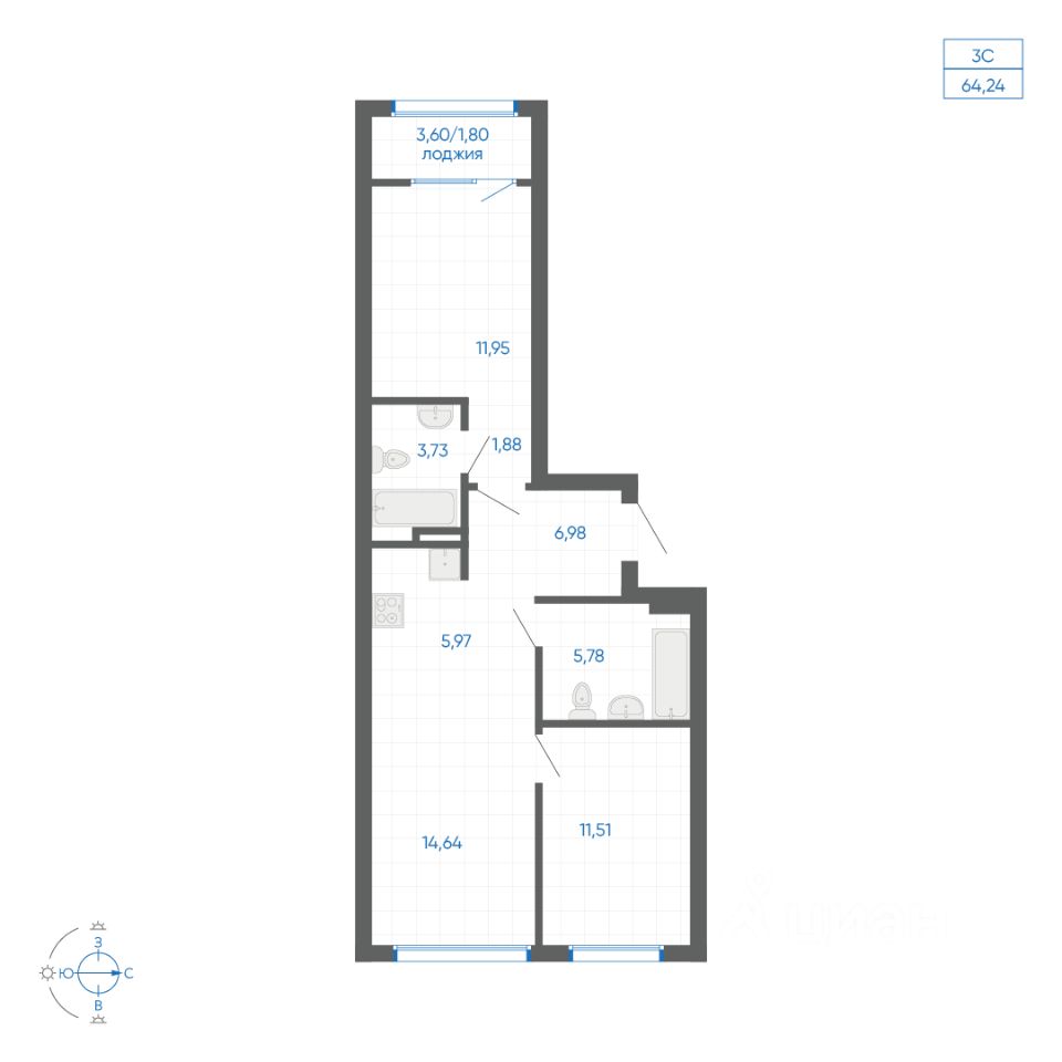 Общая площадь64,24 м²