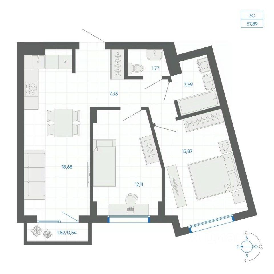 Общая площадь57,89 м²