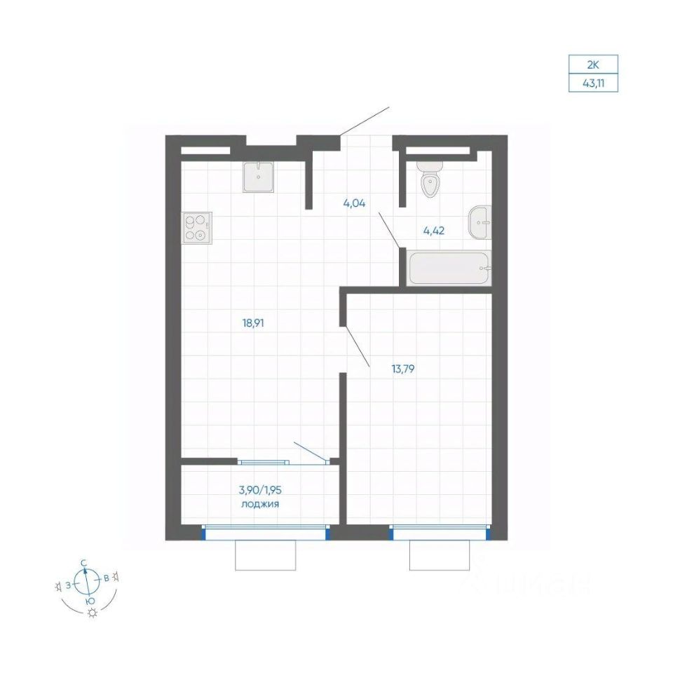 Общая площадь43,11 м²